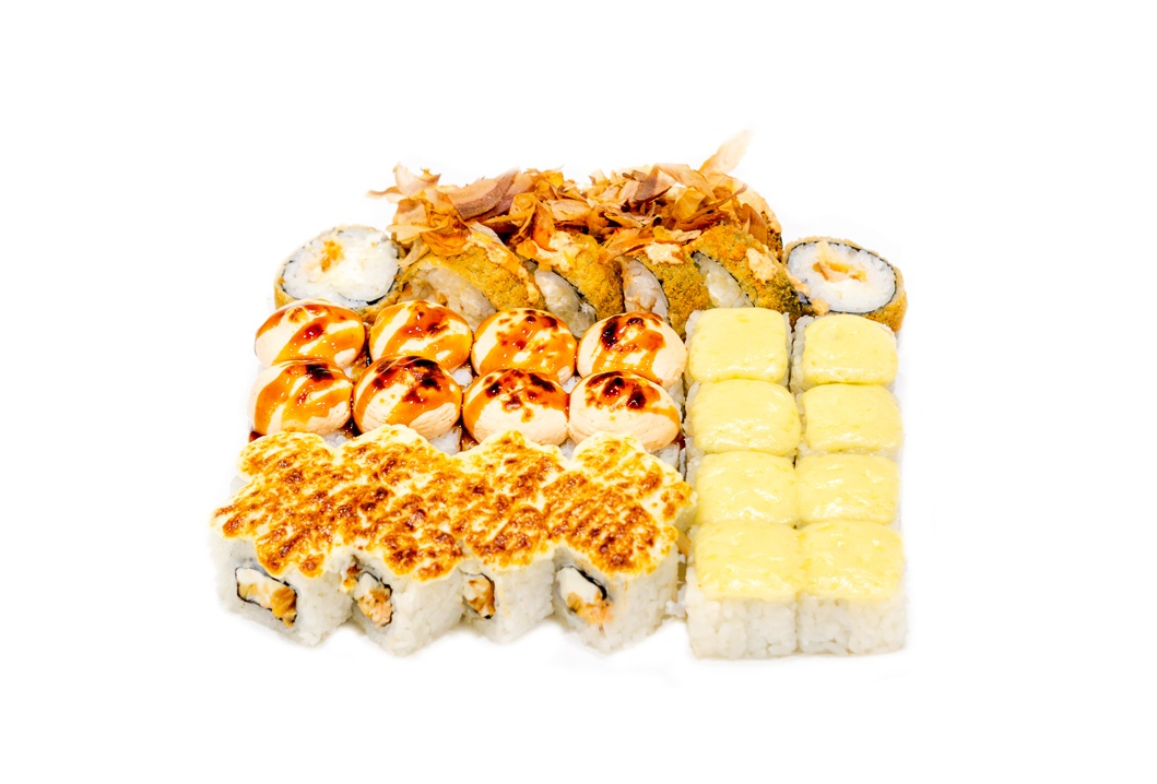 2) Ролл Трио со снежным крабом и салатом Айсберг запеченый под соусом Дор Блю 4 штуки,под моцареллово-грибной 4 штуки и под спайсовой шапочкой 4