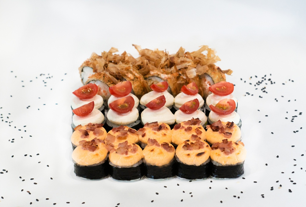 1)Ролл Сакура с куриным филе, жареным беконом и луком пореем внутри,сверху сливочный сыр и долька помидорки Черри