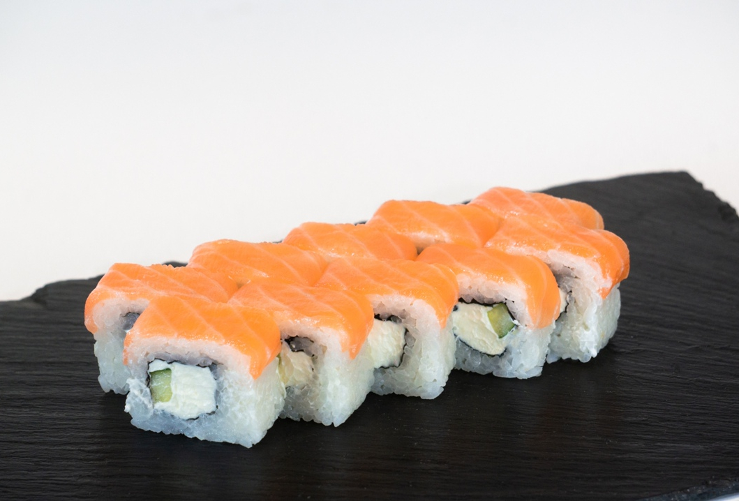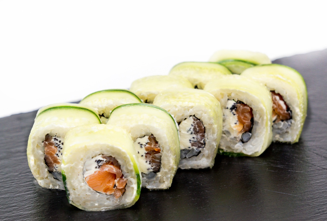 Ролл со сливочным сыром,лососем с/с и маком,сверху завернутый огурцом.