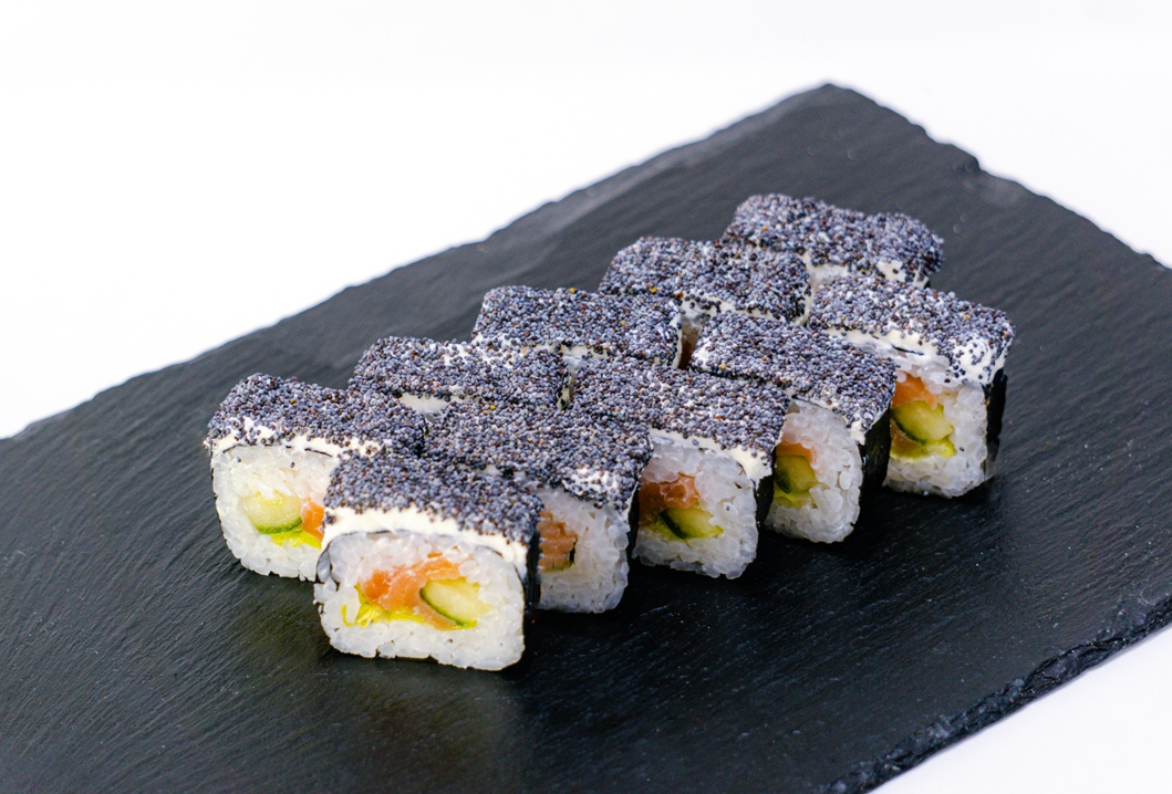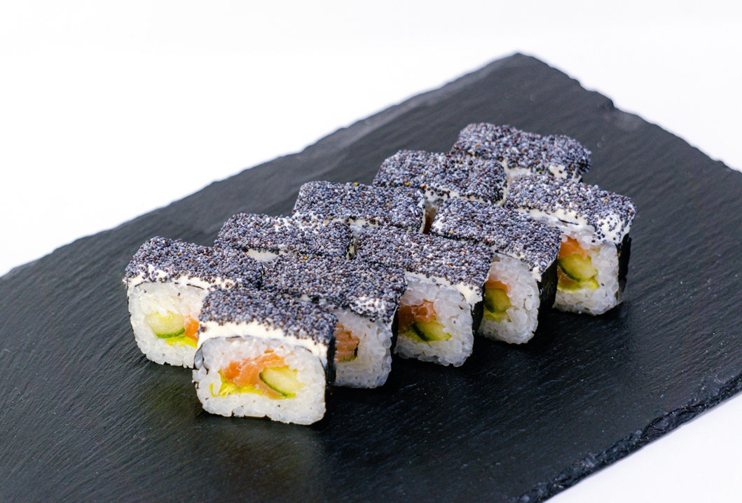 Ролл со слабосоленым лососем,салатом айсберг и огурцом,сверху сливочный сыр и мак
