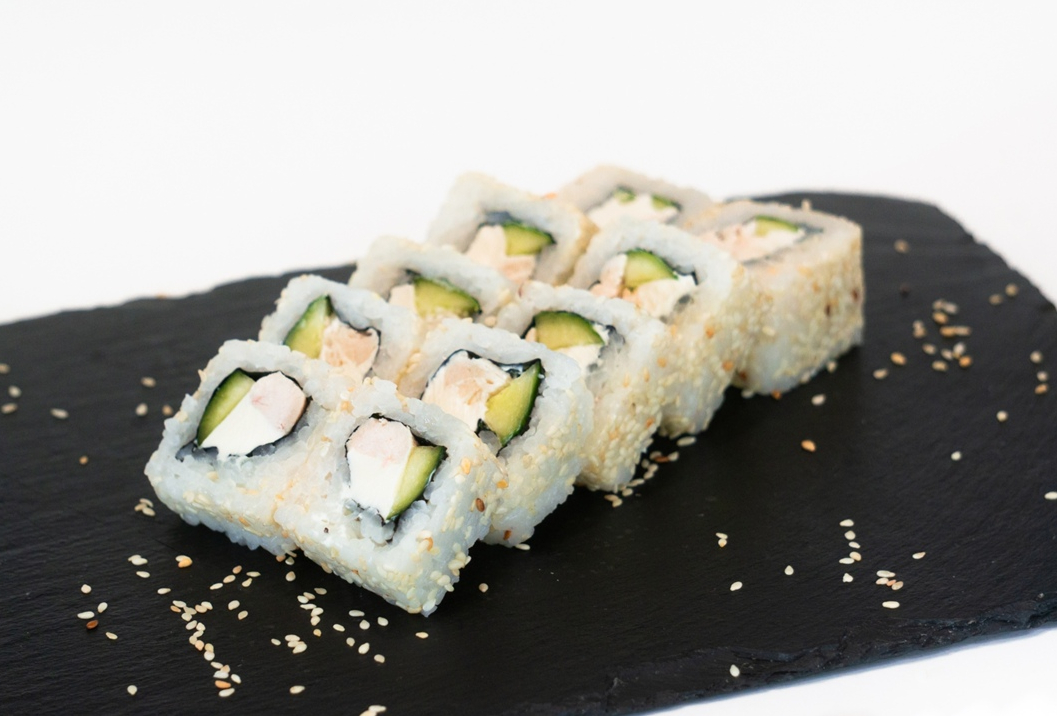 Ролл с отварной курой,сливочным сыром и огурцом, панированный жареным кунжутом.