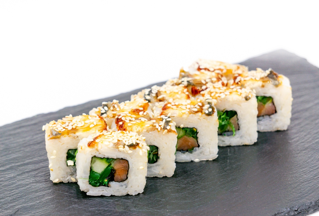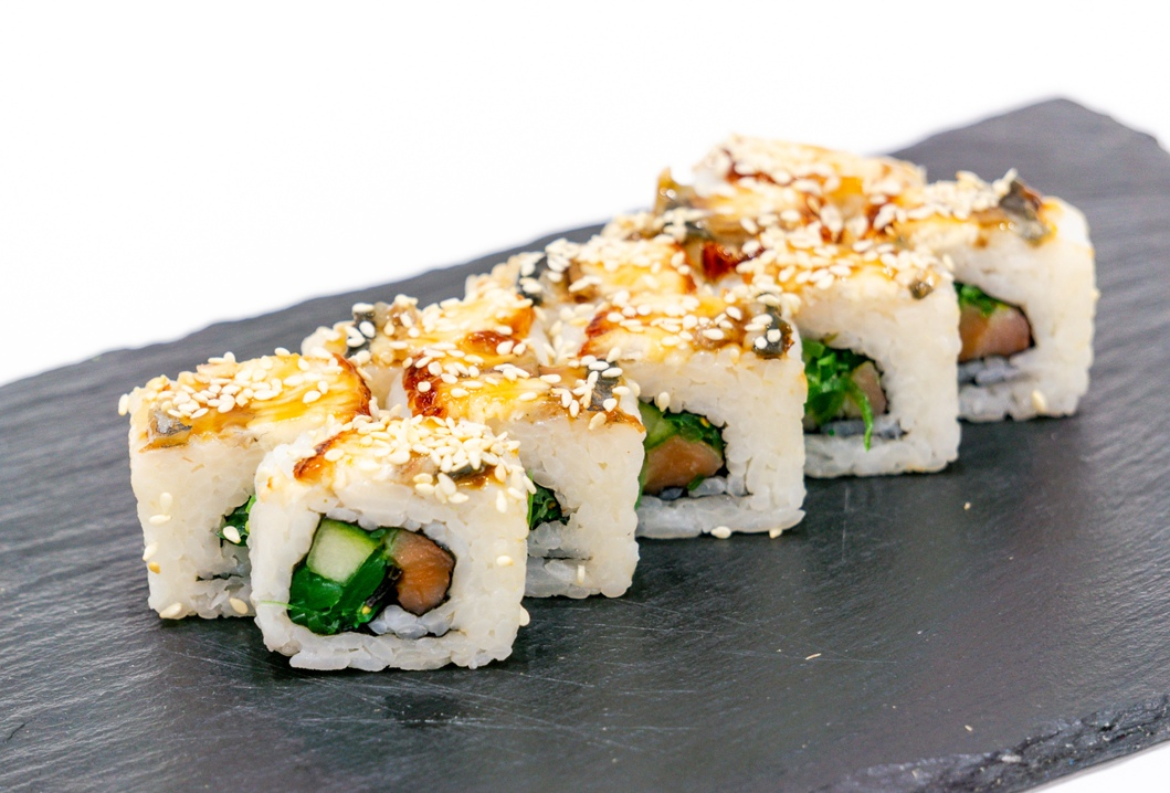 Внутри лосось с/с,салат Чука,огурец,сверху копченый угорь смазанный соусом якитория с кунжутом