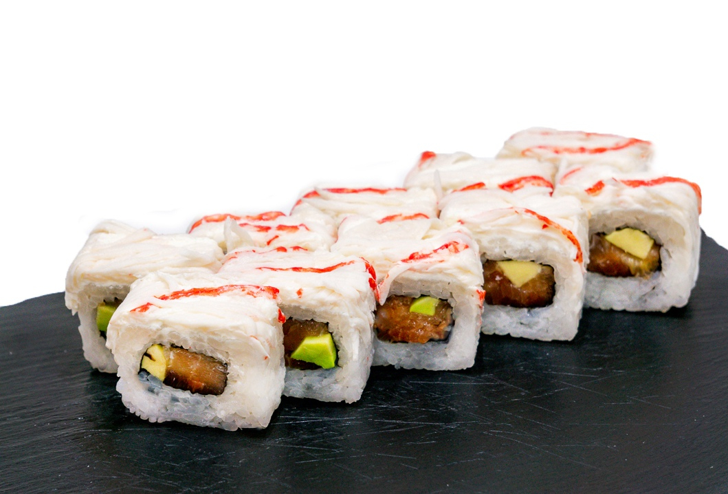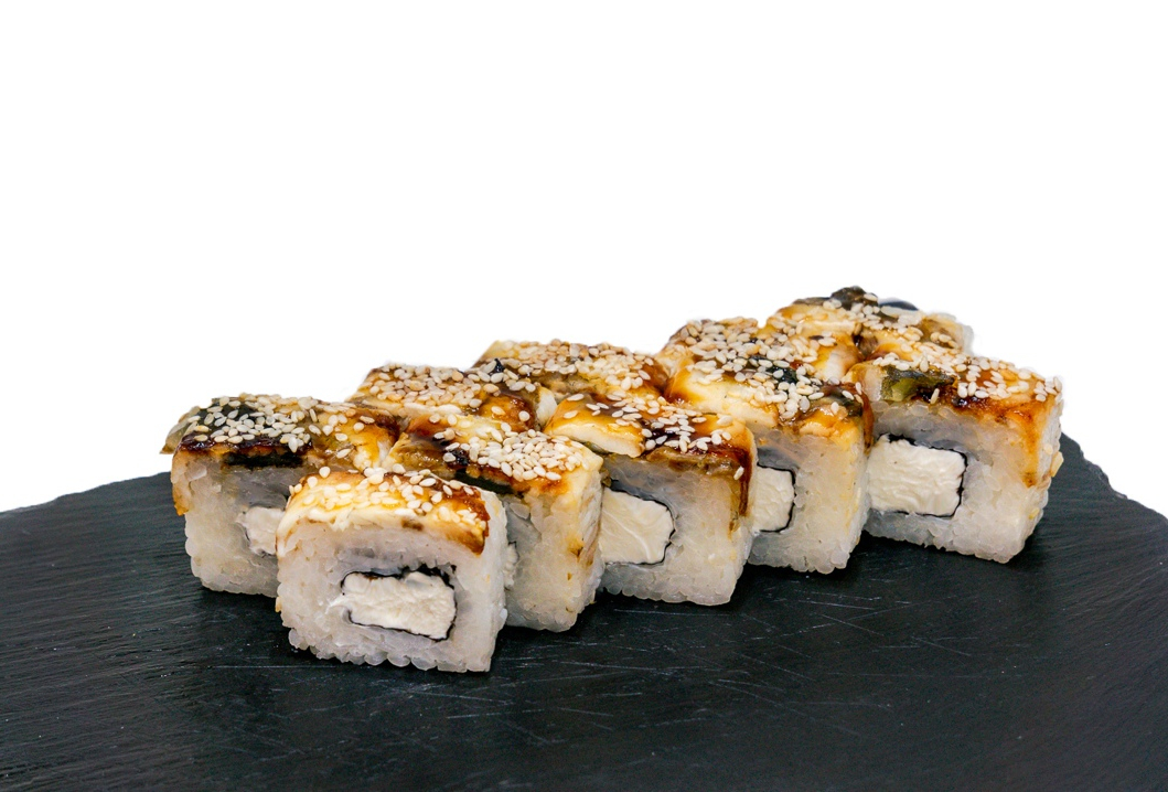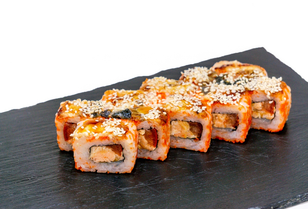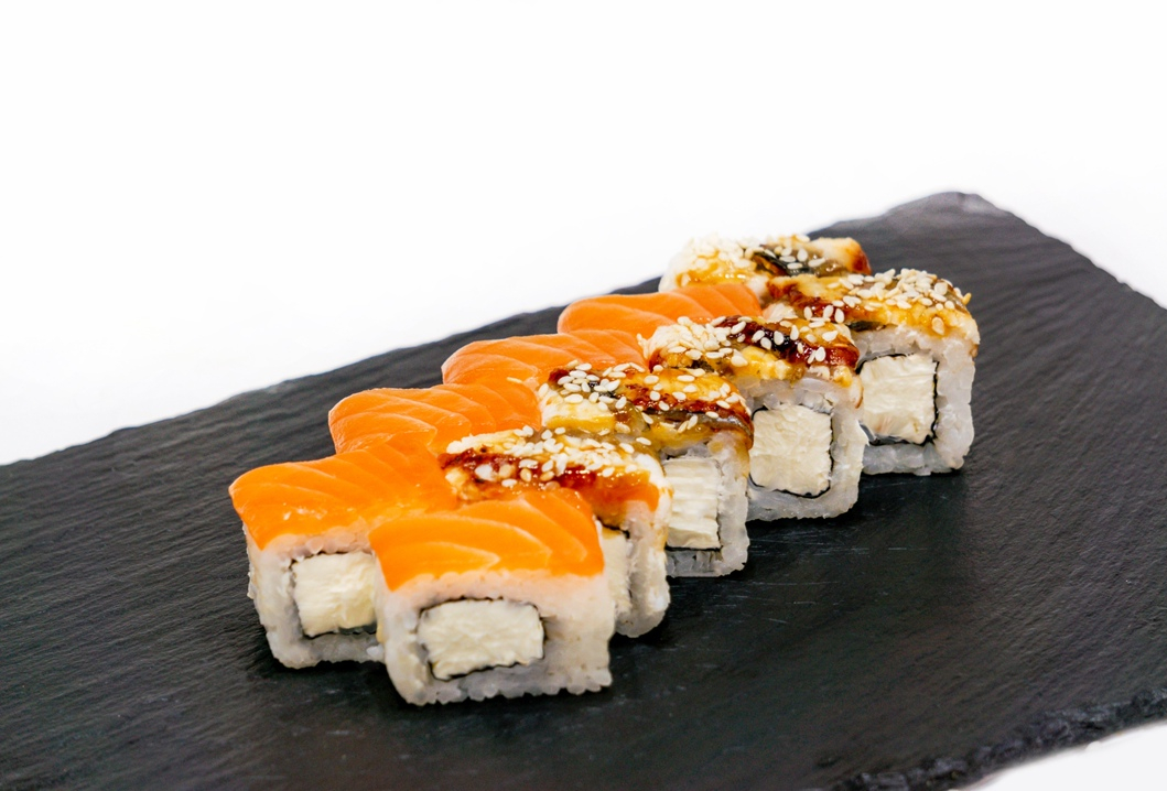 Внутри лосось с/с,авокадо,сверху копченый угорь смазанный якиторием и посыпан жареным кунжутом.