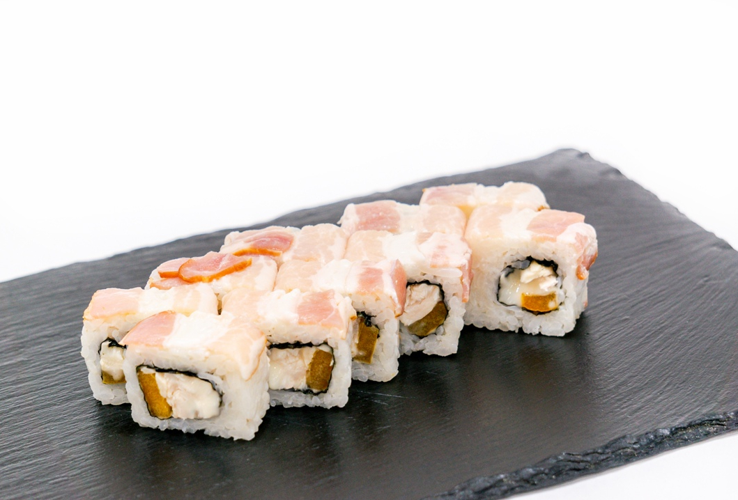 Ролл с отварной курой,болгарским перцем и плавленным сыром, сверху бекон.