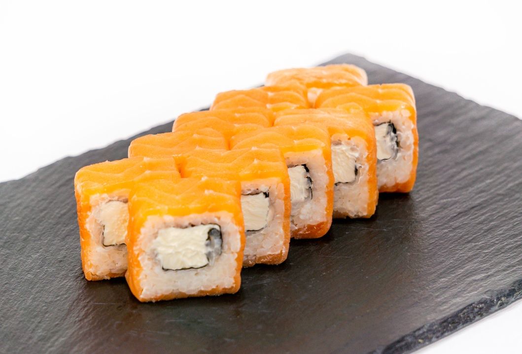 Внутри с лососем отварным,айсбергом и помидоркой,сверху панированный икрой масаго и копченым угрем.