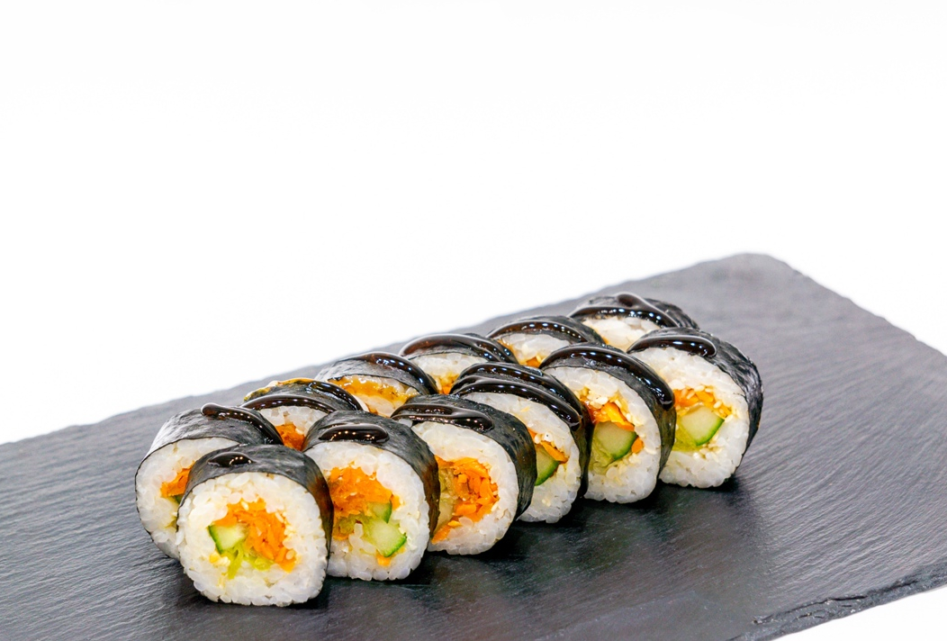 Ролл с морковкой по корейски, салатом айсберг и огурцом,панированный жареным кунжутом и смазанный соусом якитория.