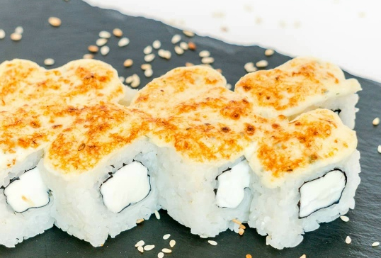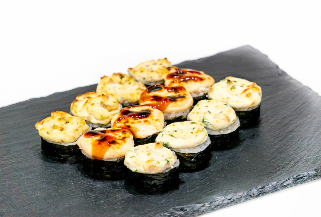 Ролл с отварным лососем,имитированным крабом и луком пореем, запеченный под сливочно-спайсовой шапочкой