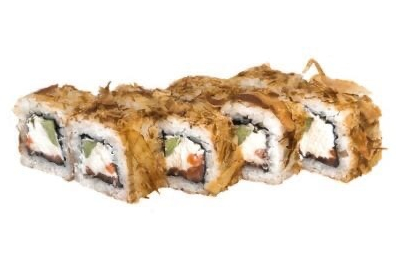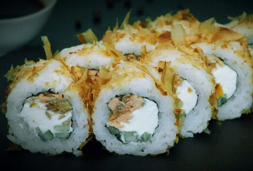 Ролл с отварным лососем,сливочным сыром и огурцом внутри,сверху в стружке тунца