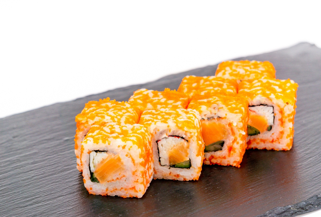 Ролл с лососем х/к со сливочным сыром и огурцом, панированный икрой Масаго