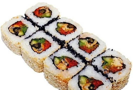 Внутри мясо мидии гигант,2 вида икры Масаго,огурец.Сверху панированный жареным белым и черным кунжутом