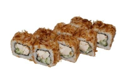 Внутри курица, сливочный сыр и огурец, сверху панированный стружкой тунца
