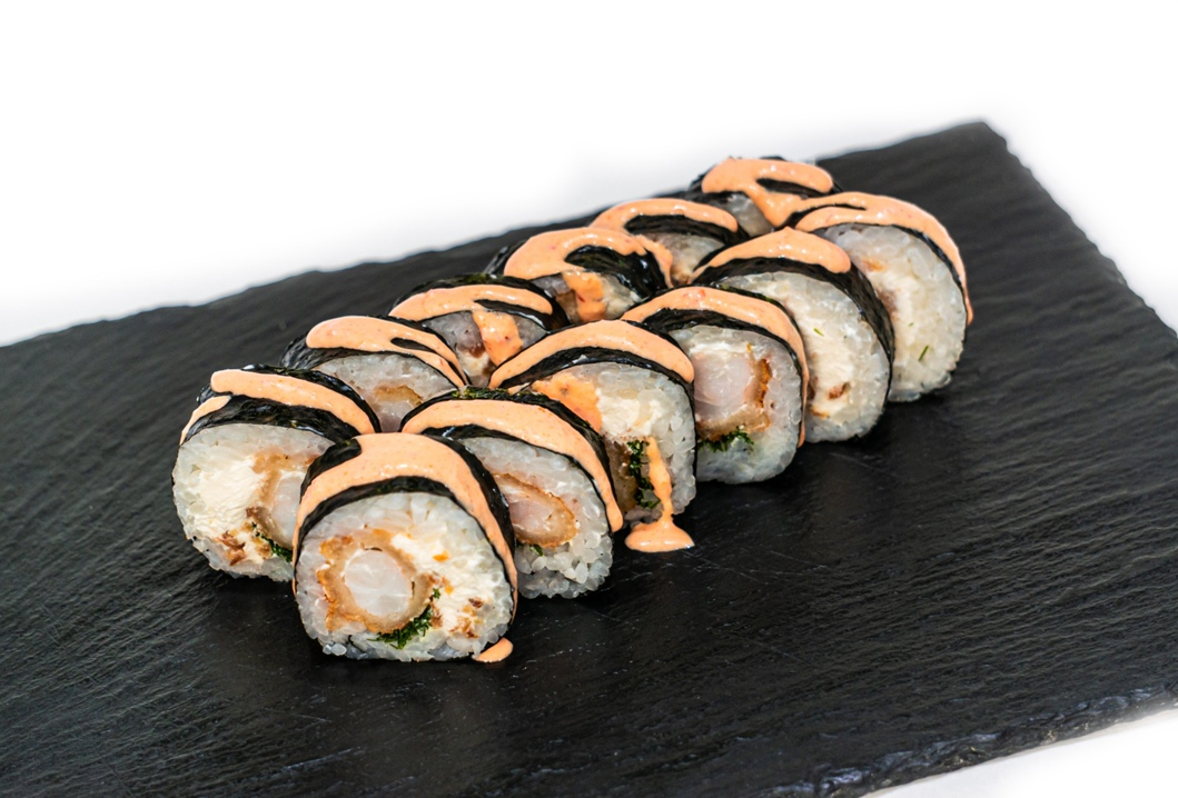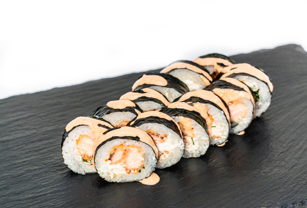 Ролл с жареным лососем в сухарях со сливочным сыром, зеленью и луком сверху поливается соусом спайси.