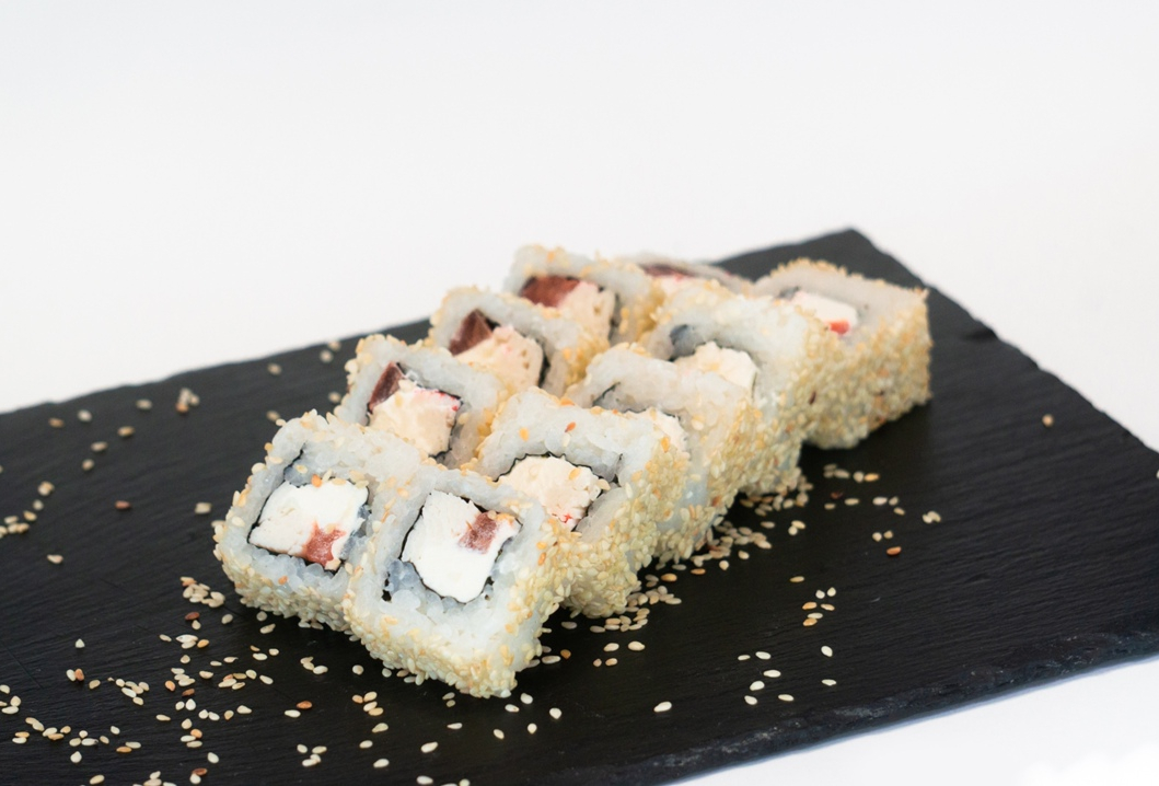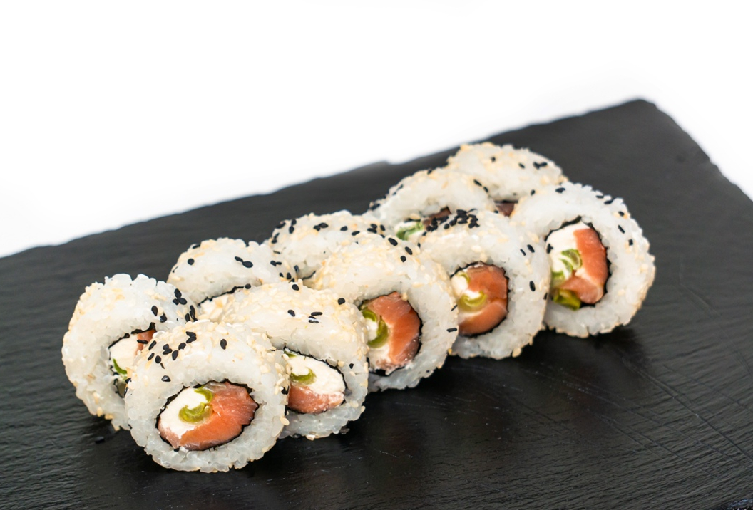 Ролл со слабосоленым лососем,сливочным сыром,зелёным луком, посыпанный жареным кунжутом