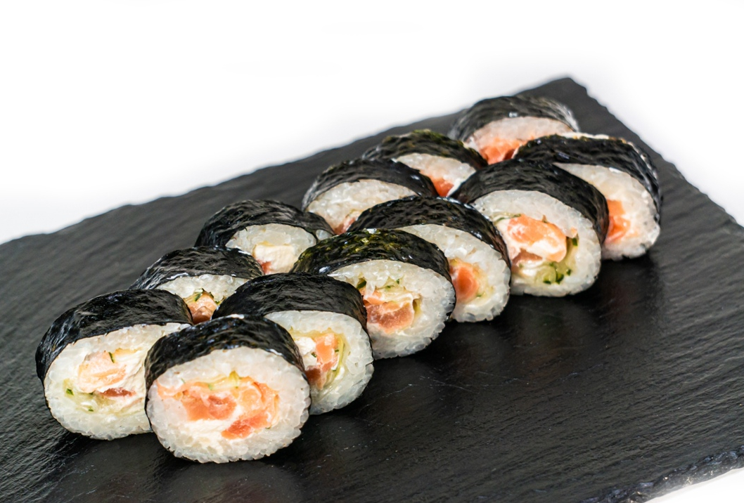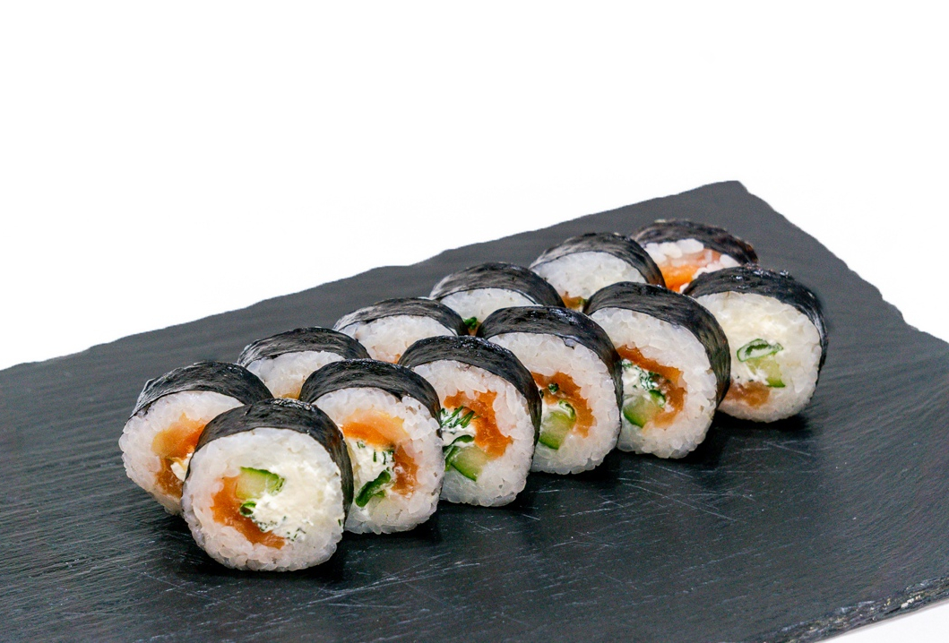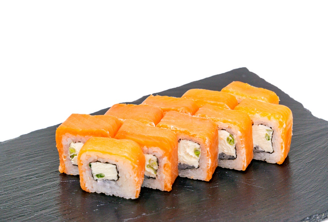 Ролл Филадельфия со сливочным сыром и зелёным лучком,обернутый копчёным лососем