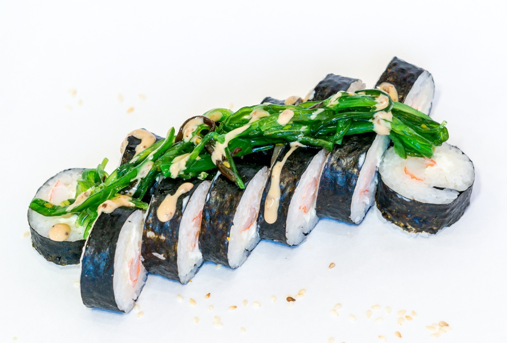 Ролл с отварными тигровыми креветками и сливочным сыром внутри.Подается с салатом Чука под ореховым соусом Гамадарий