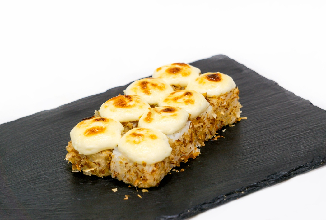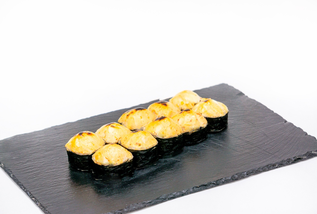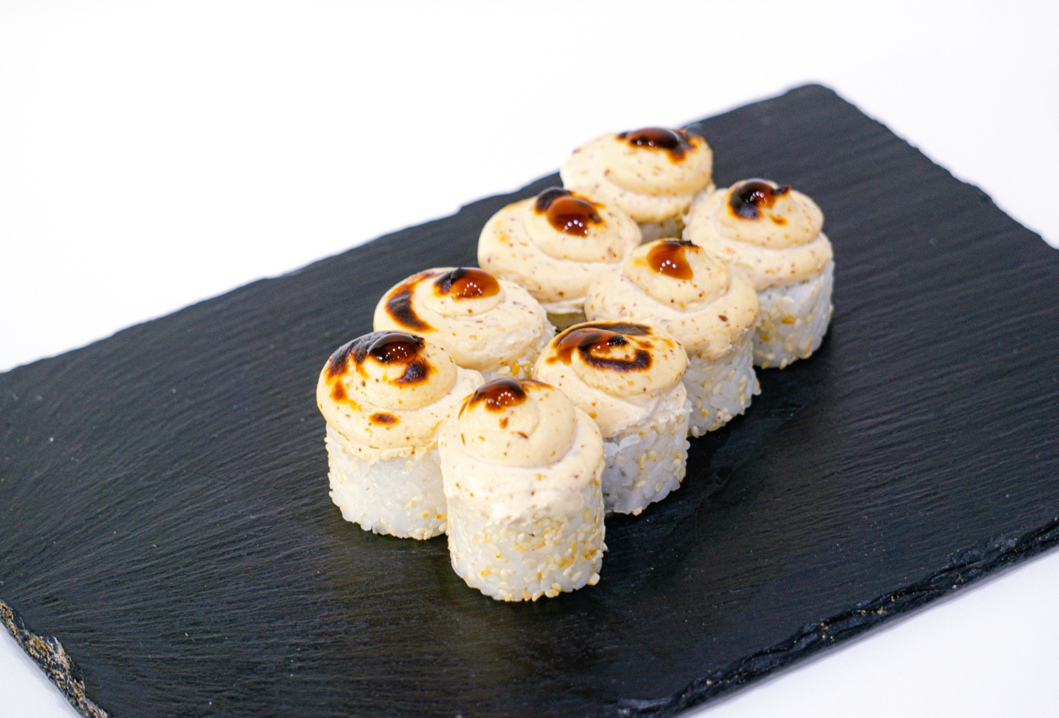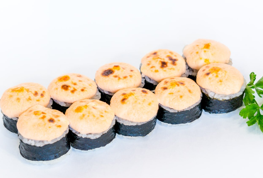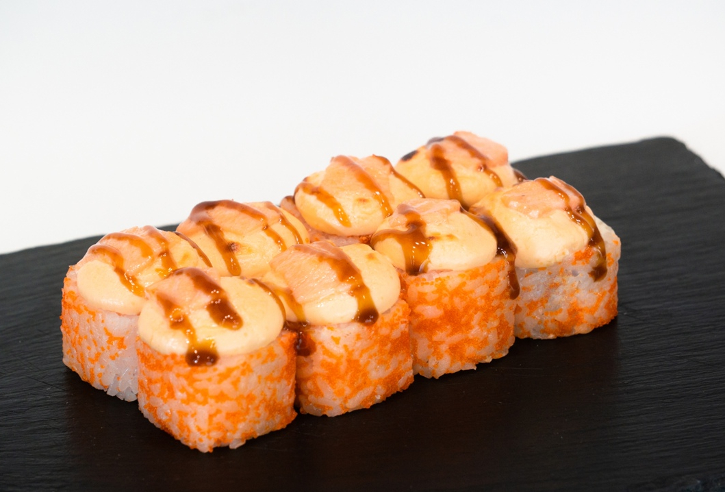 Ролл с отварным лососем,имитированным крабом и луком пореем, запеченный под сливочно-спайсовой шапочкой