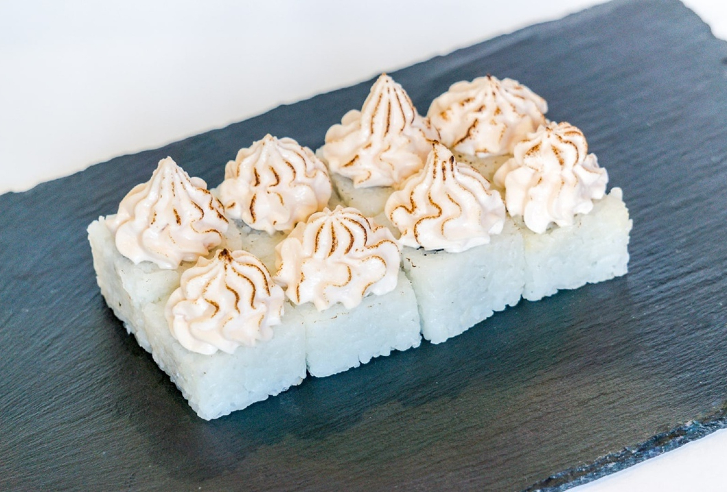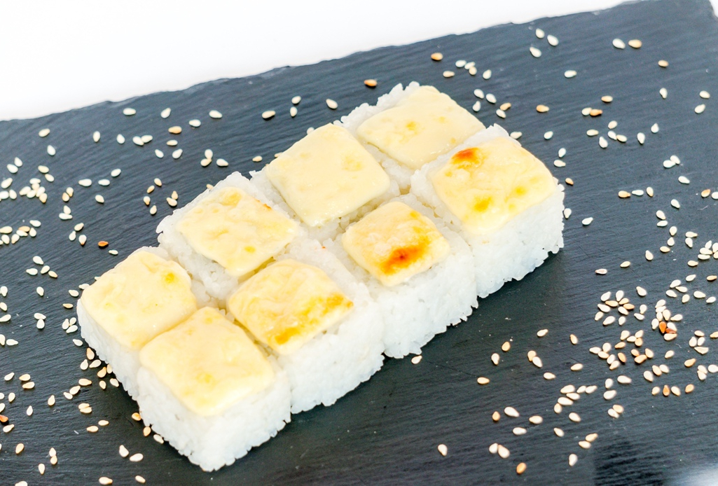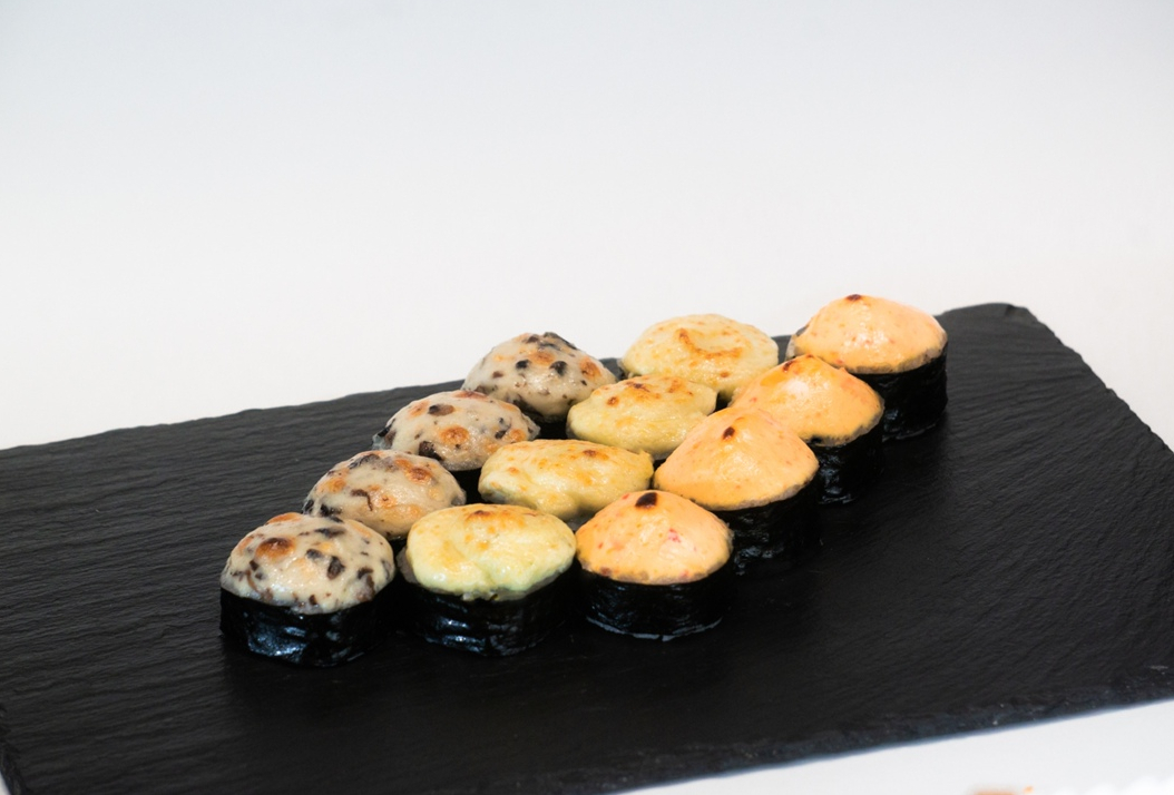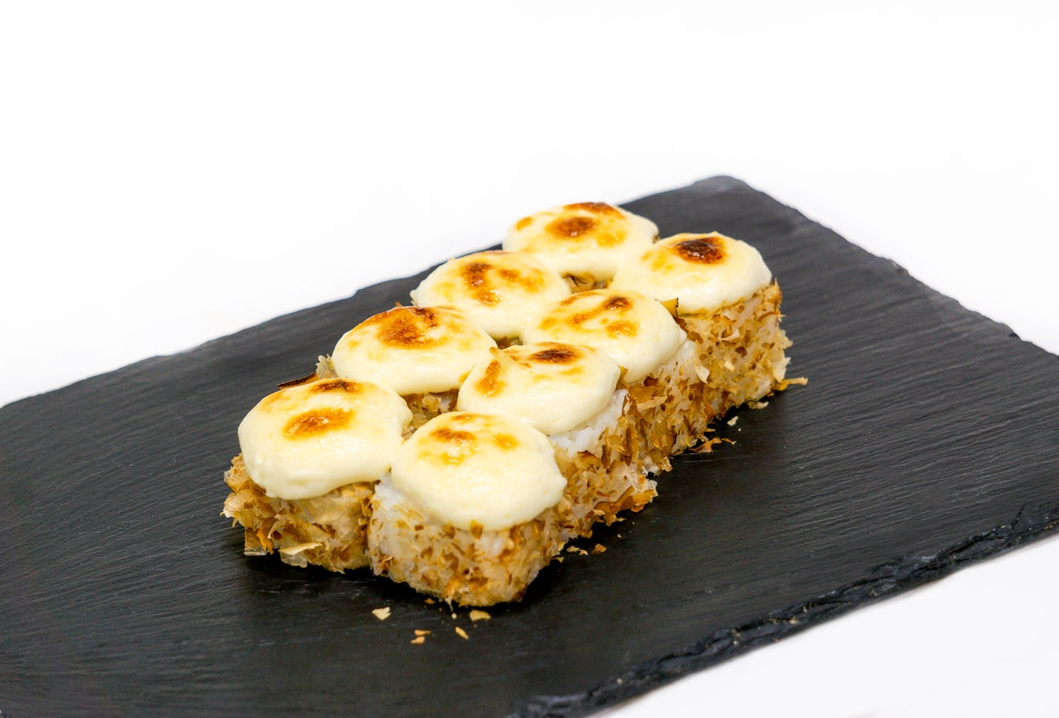 Ролл с отварным лососем,имитированным крабом и луком пореем, запеченный под сливочно-спайсовой шапочкой