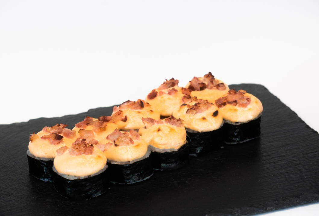 Ролл с лососем и авокадо запеченный под сливочно-икорной шапочкой с беконом