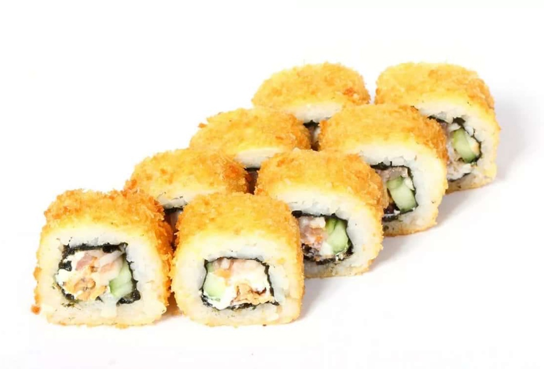 Ролл жареный в сухарях Панко и запеченый под грибной шапкой.