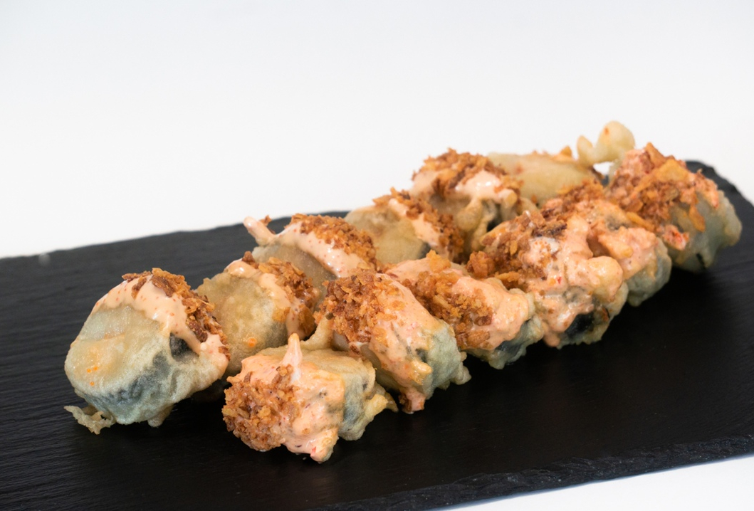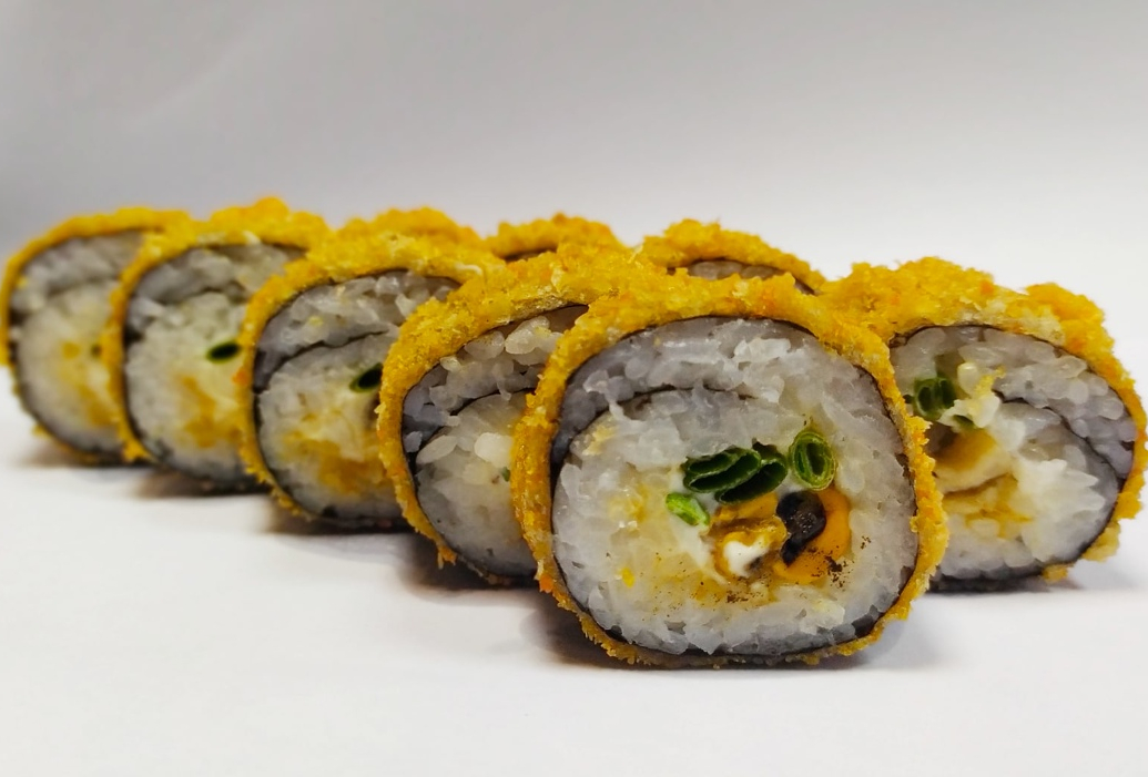 Ролл с мидиями гигант ,сливочно-горчичным сыром, зелёным луком, жареный в сухарях Панко