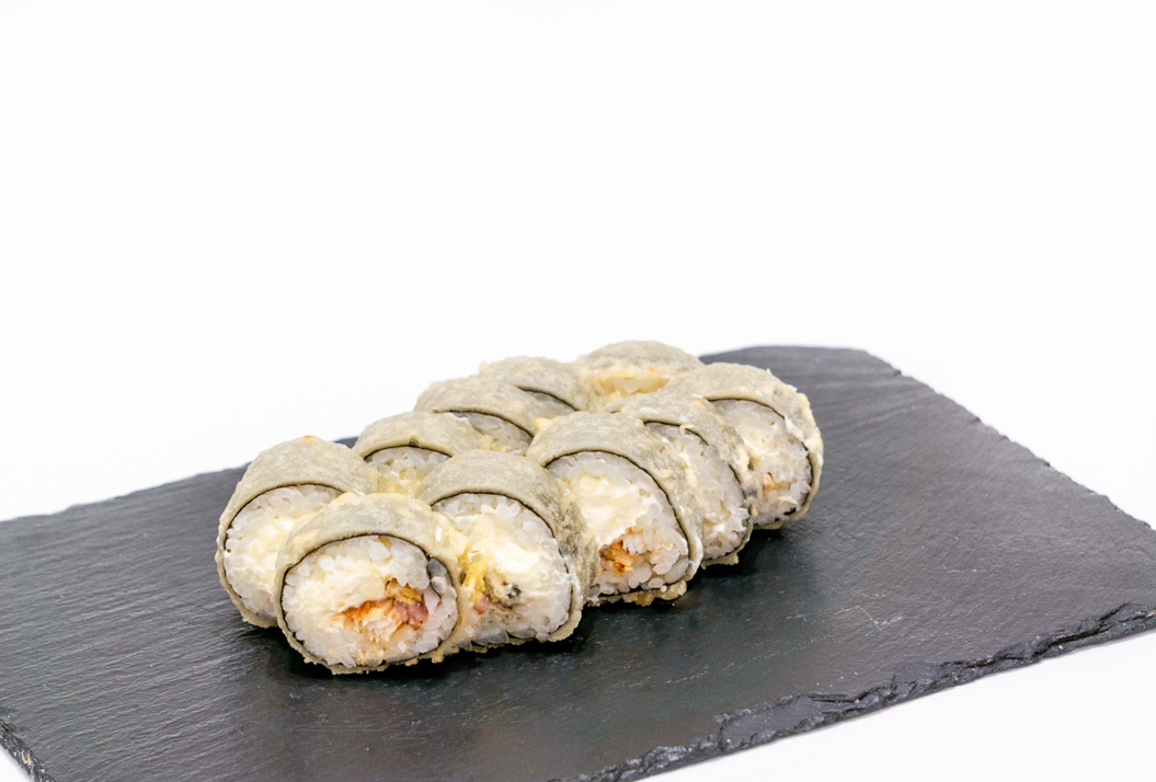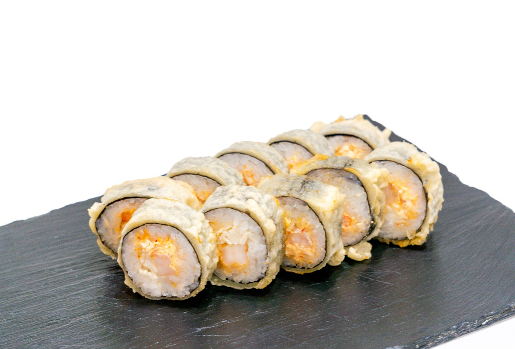 Ролл с отварными креветками,имитированным крабом,сливочным сыром и спайс соусом, жареный в тесте