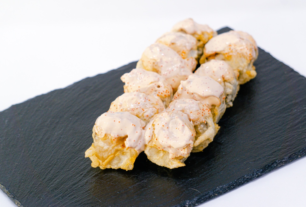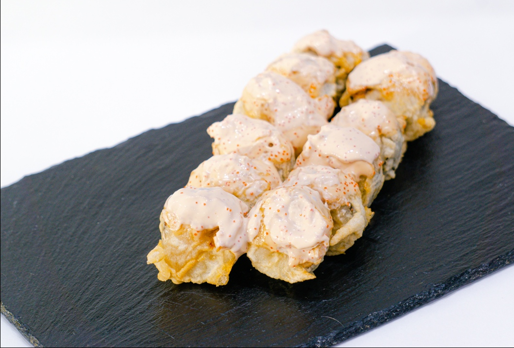 Горячий,жареный ролл в тесте с копченой скумбрией яблоком, зелёным луком,сверху смазанный соусом якитория, майонезом и икрой масаго.