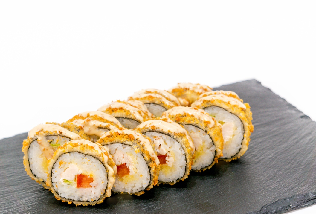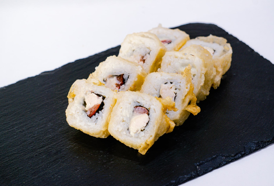 Горячий ролл жареный в темпуре с курой, помидоркой и плавленным сыром.